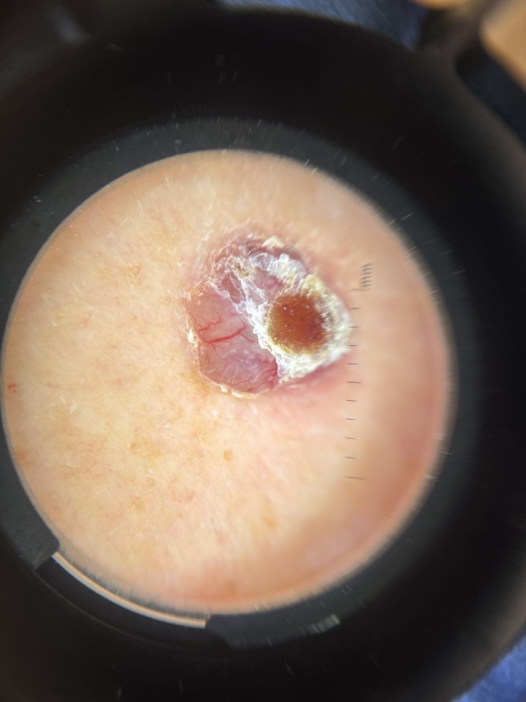 - Il peut être ulcéré au centre ou former une croûte qui ne cicatrisera pas et reviendra, c’est un signe très fréquent.